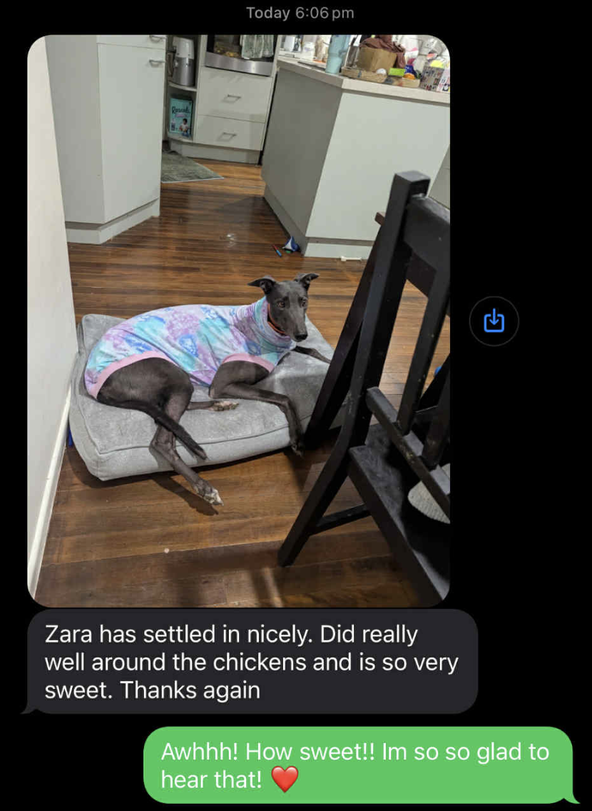 Thank you to every family that welcomed a Greyhound into their home. We would love to hear updates. Here are some of them.